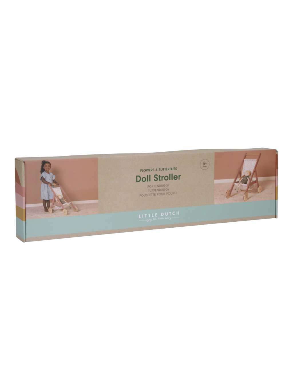 Vezmite svoju bábiku na prechádzku! Drevený kočík pre bábiky s krásnou potlačou z kolekcie Kvety a motýle si zamilujete.