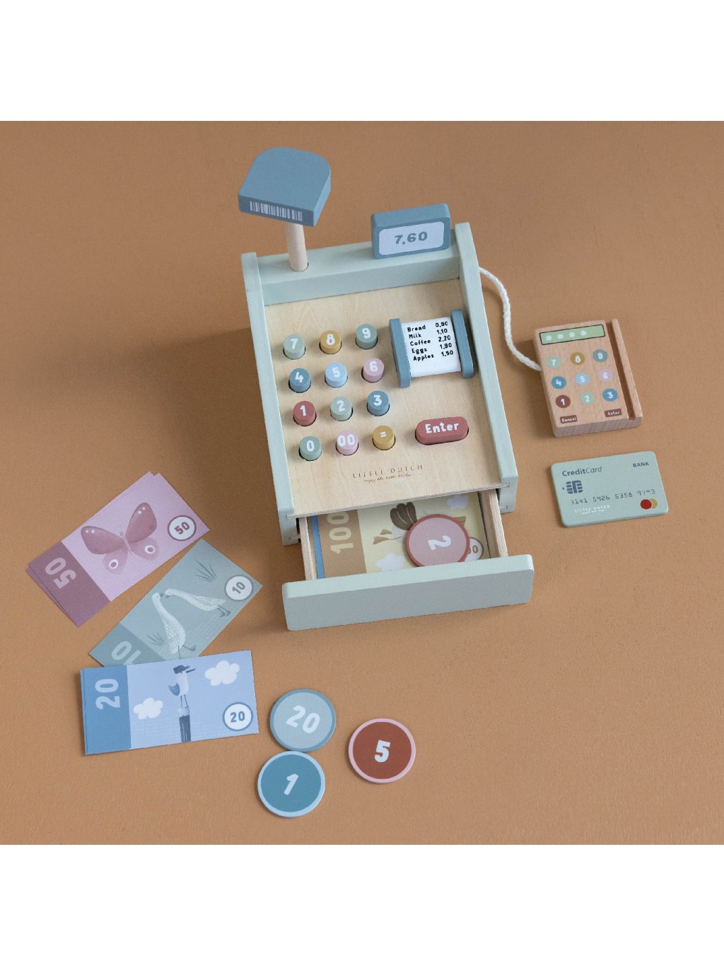 Táto krásne navrhnutá pokladňa so skenerom je ideálna pre hodiny príjemnej hry na predavačov. Registračná pokladnica obsahuje skener, čísla tlačidiel, zásuvku na peniaze, peniaze na hračky a možnosť platiť platobnou kartou. K dispozícii v krásnej farbe mäty.