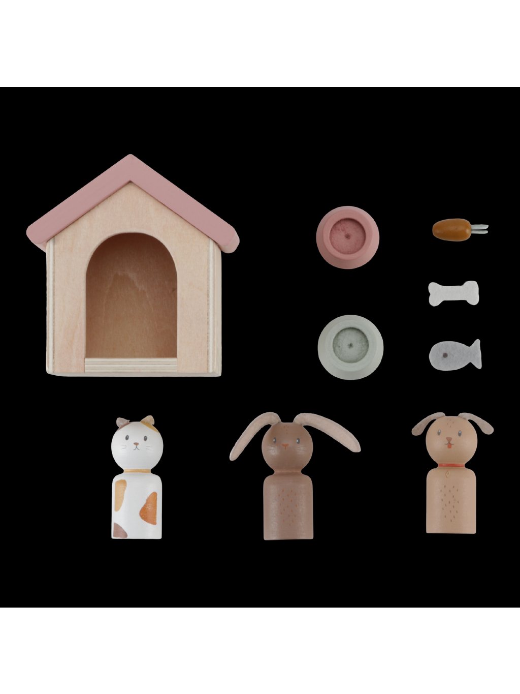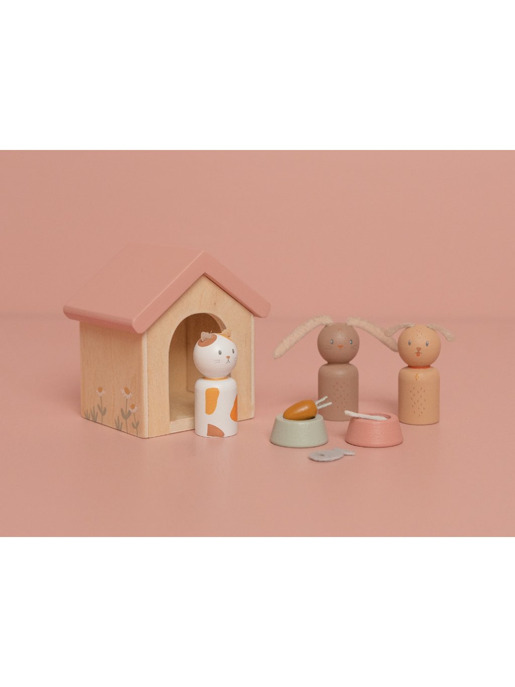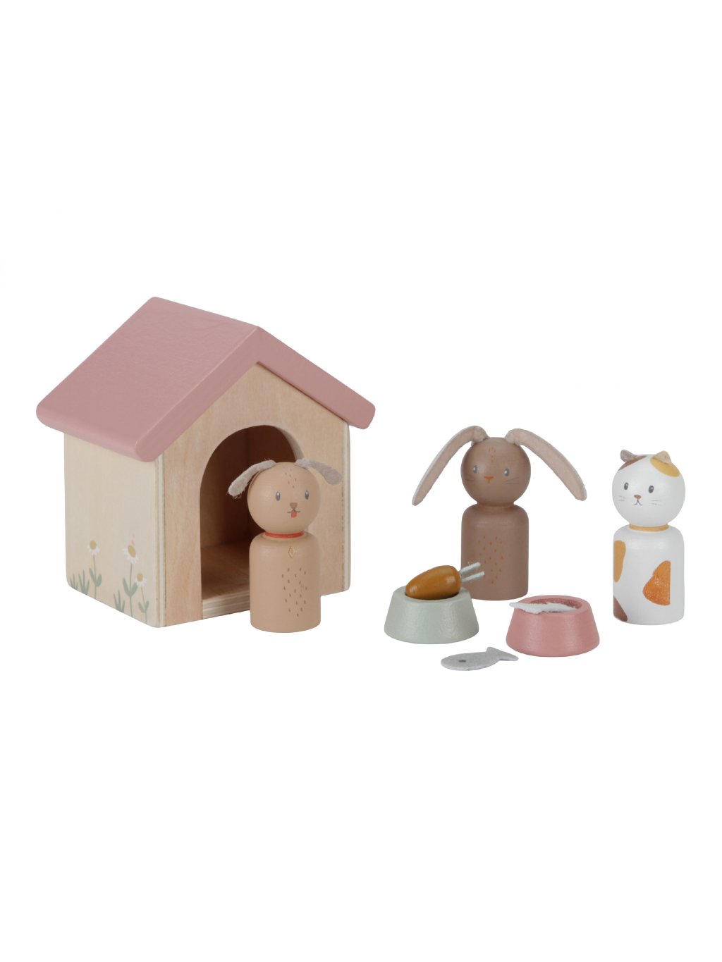 Sada s domácimi miláčikmi v krásnom drevenom prevedení je vhodný doplnok k drevenému domčeku pre bábiky Little Dutch. Sada obsahuje psíka, mačičku, zajačika, psiu búdu, dve misky, mrkvičku, rybu a kosť.