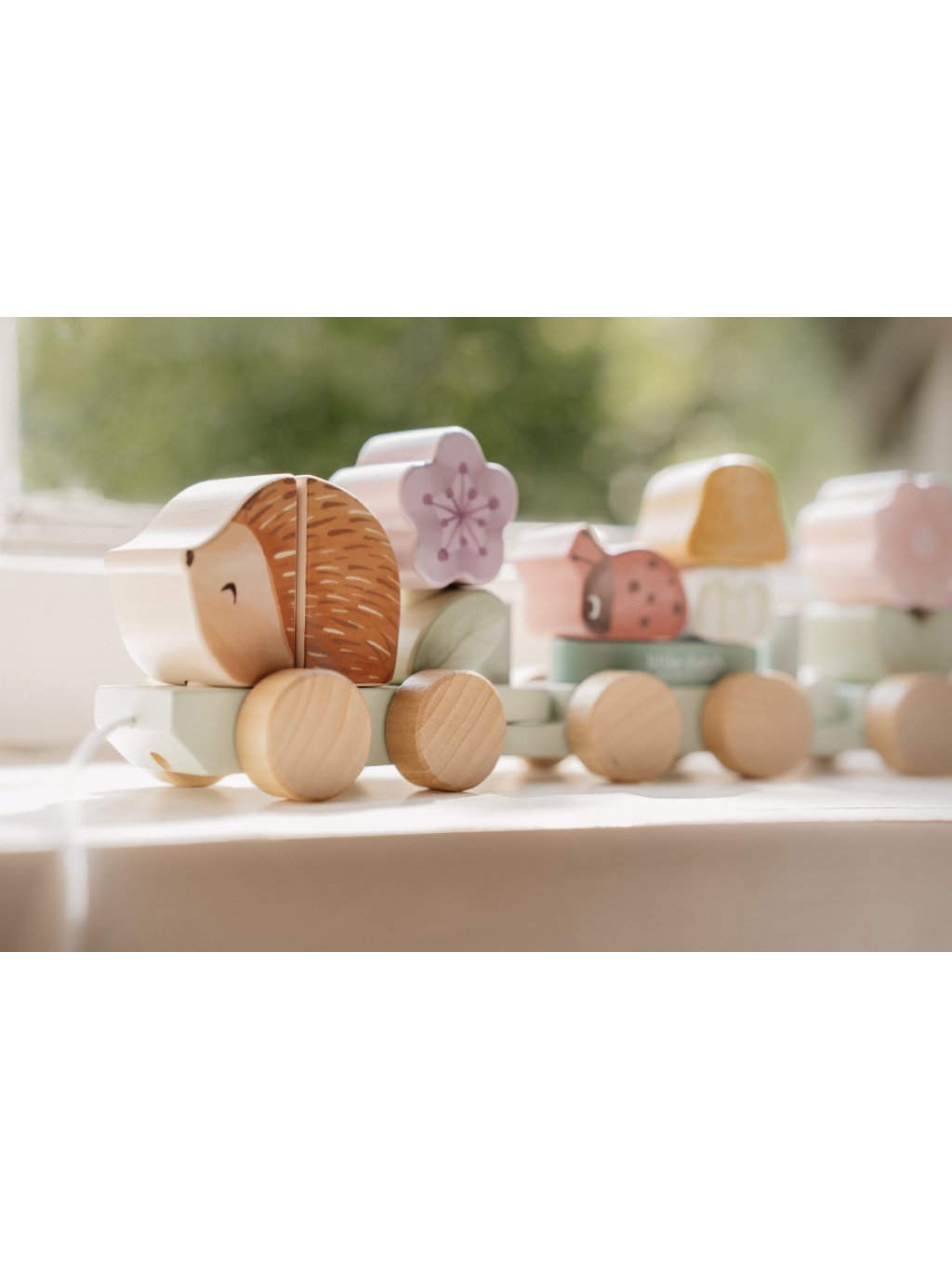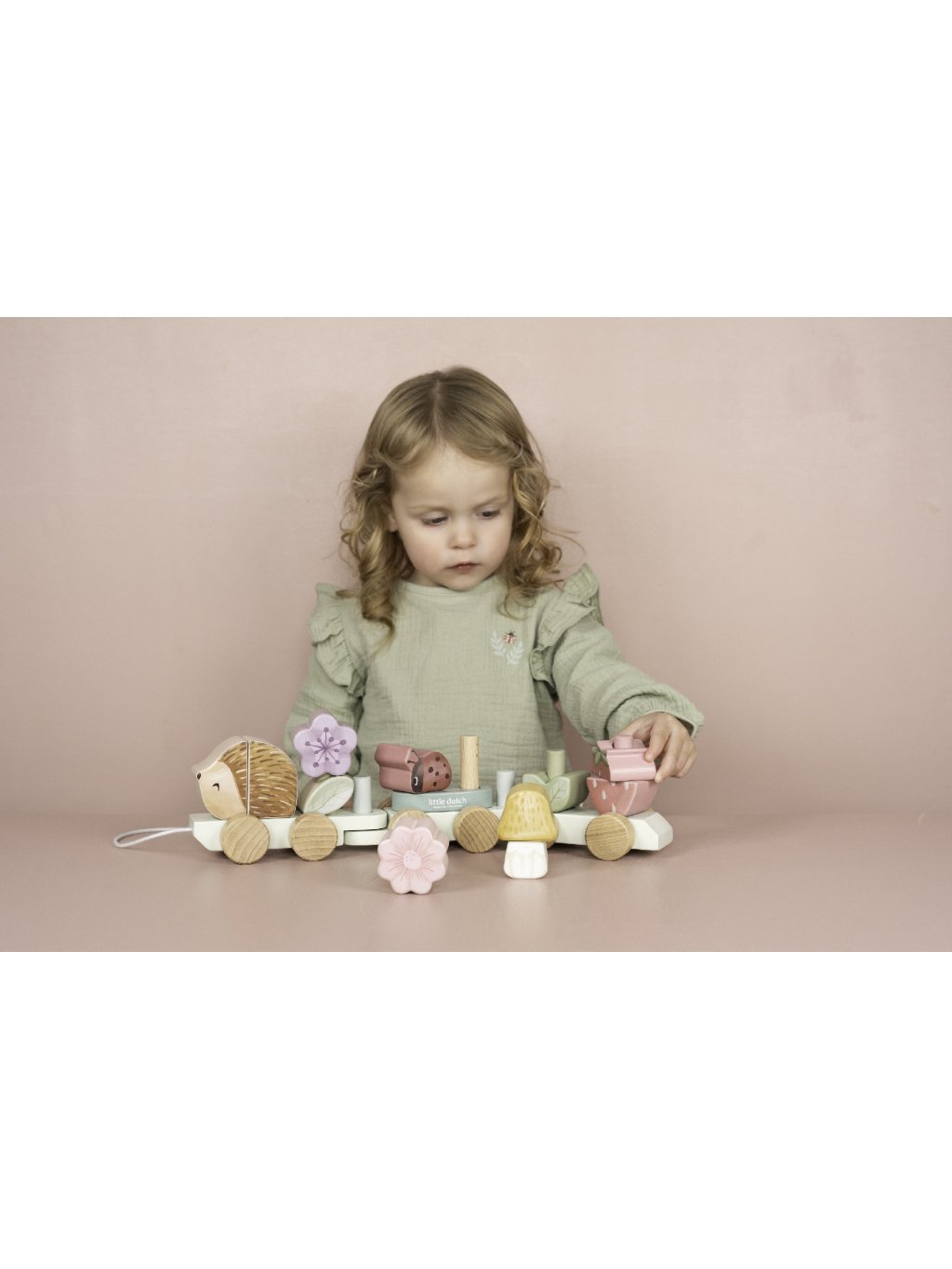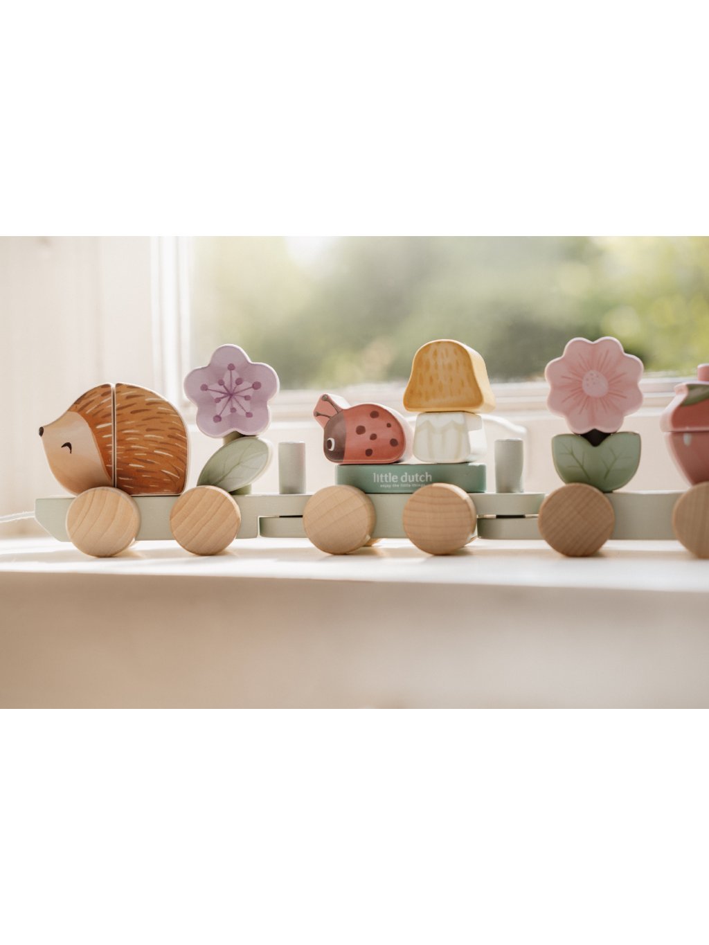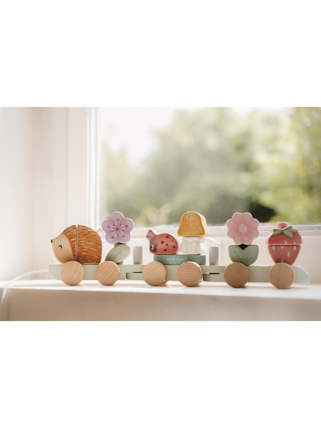 Originálny drevený vláčik z dielne Little Dutch je tvorený kockami rôznych farieb v tvare ježka, lienky, huby, kvetov a jahody. Kombinovaním kociek si vaše dieťa môže zostavovať rôzne varianty vagónov podľa svojej fantázie. Vláčik zaistí vášmu dieťaťu veľa zábavy a môže slúžiť aj ako krásna dekorácia v detskej izbe. Hračka je súčasťou dizajnovej kolekcie hračiek a doplnkov Little Dutch Fairy Garden inšpirovanej životom na záhrade. Vyrobené z dreva certifikovaného FSC. Rozmery: 38,2 x 7 x 10,6 cm Vhodné pre deti od 18 mesiacov.